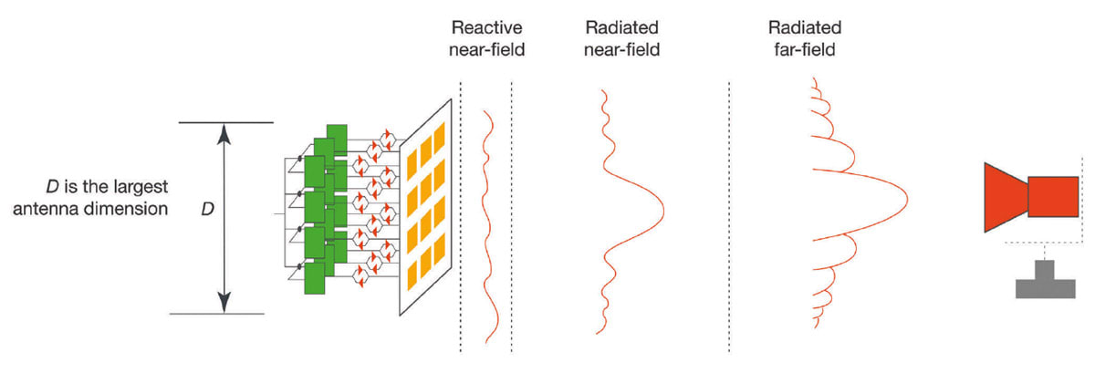 It is possible to perform OTA tests for either the near-field or far-field. While near-field measurements may be appropriate for some applications, 5G cellular communication requires far-field assumptions. The far-field distance and path loss associated with radiated waves increase with frequency due to the nature of the waves. Figure 2 shows how the characteristics of these signals change as they propagate from antenna arrays and develop further in the far-field region.