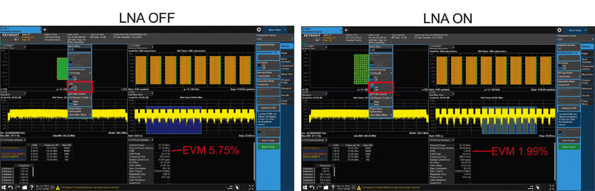 Tip 4: A low-noise amplifier (LNA) at the front-end of the signal analyzer reduces the system noise figure with, or without the internal preamplifier to optimize the mixer’s input level. Signal analyzers can feature integrated LNA and preamplifiers for various test scenarios in FR1 and FR2 applications. A two-stage gain optimizes the measurements at low input levels to reduce the noise and provide the best performance while balancing noise and distortion. Figure 3 shows an example of 5G demodulation where turning the LNA on (right) improves the EVM significantly, enabling it to go from 5.75 percent to 1.99 percent.