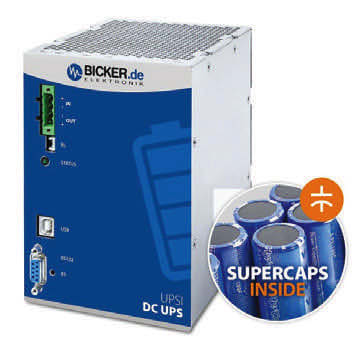 The new DC UPS UPSI-2412DP2 from Bicker Elektronik, Donauwoerth, Germany, reliably protects safety-relevant 24VDC applications against system failure and data loss. Fast-charging and maintenance-free supercapacitors are used for buffering the DC supply voltage. Due to their high cycle stability, supercapacitors have a particularly long service life and are maintenance-free. Under comparable operating conditions, supercapacitors have a service life up to 10 times longer than classic lead-acid batteries.