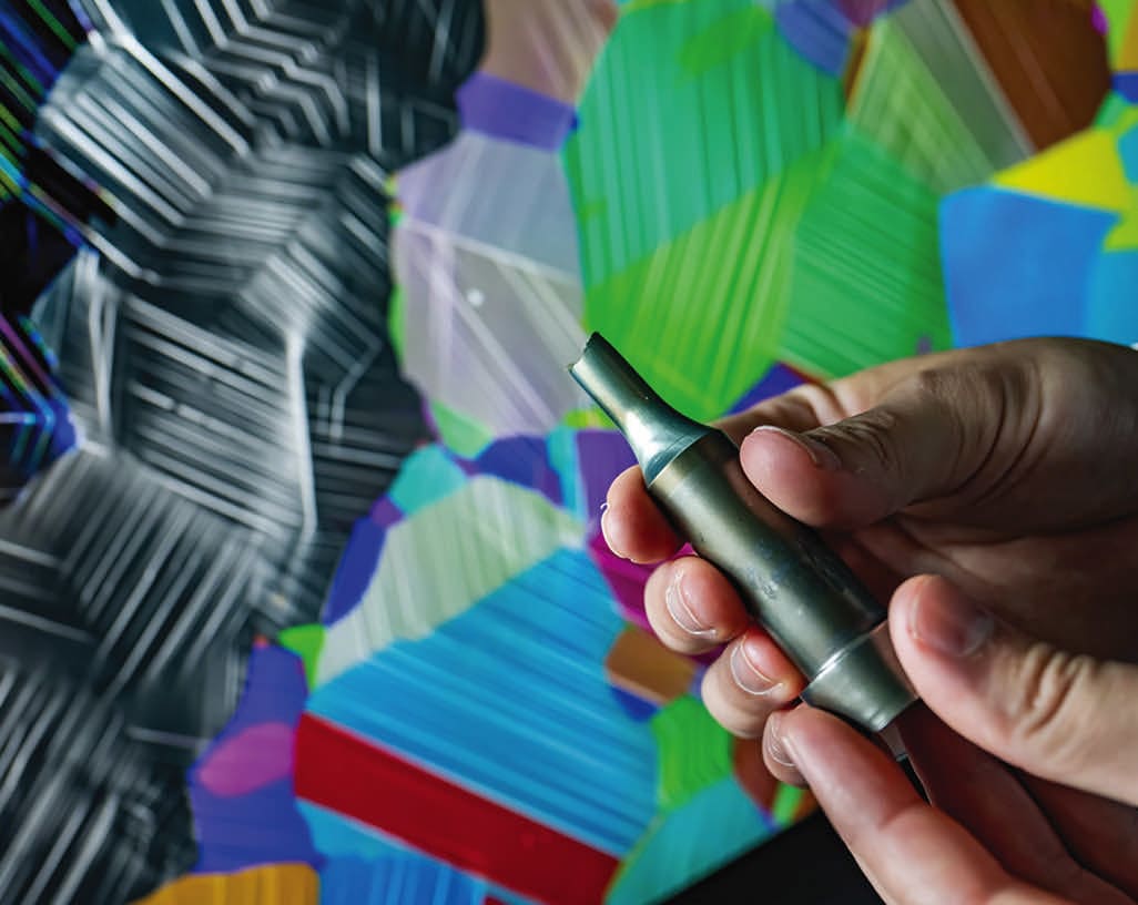 The foreground shows a fractured sample of an alloy used in aircraft engines. In the background, each color represents an orientation of the metal’s crystal structure. The gray lines indicate a specific measurement and inform how the metal deforms. The color of the lines indicates how intensely the atoms have been disrupted as a result of mechanical loading. (Image: Fred Zwicky)