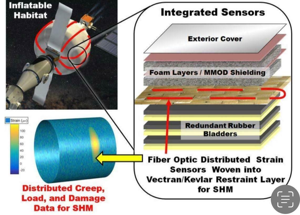 - Embedded Fiber Optic SHM Sensors for Inflatable Space Habitats, by Osgar John Ohanian III,1 Matthew A. Davis, Luna Innovations Incorporated, Blacksburg, VA, 24060,USA; Jeffrey Valania, Benjamin Sorensen, Sierra Nevada Corporation, Louisville, CO,USA; Megan Dixon, Matthew Morgan, ILC Dover, Frederica, DE, USA; Douglas A. Litteken, NASA Johnson Space Center, Houston, TX, USA.