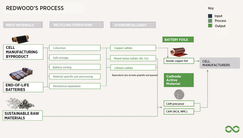 Redwood Materials, which said in 2021 that it had raised $775 million from investors and venture firms, is headed by former Tesla CTO JB Straubel. The company intends to not only capture metals from old batteries, but also process those materials into new cathodes and anode copper foils — critical components now mainly made in Asia. According to Redwood, it can recapture 95 percent of the elements, including nickel, cobalt, lithium, and copper, from Li-ion batteries, then reprocess them into new battery materials for its customers.
