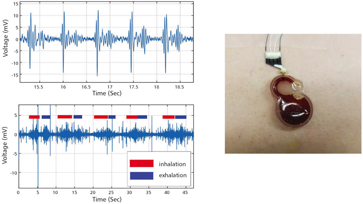 Respiration can be detected by this device in two different ways. Because of the sensor’s stretchability, it deforms when the chest contracts and expands during breathing, functioning as a strain sensor. The other way the sensor detects respiration is due to the way the volume of the chest cavity changes during a breath, modulating the heartbeat signal. In this way, respiration is detected indirectly through changes in the heartbeat.