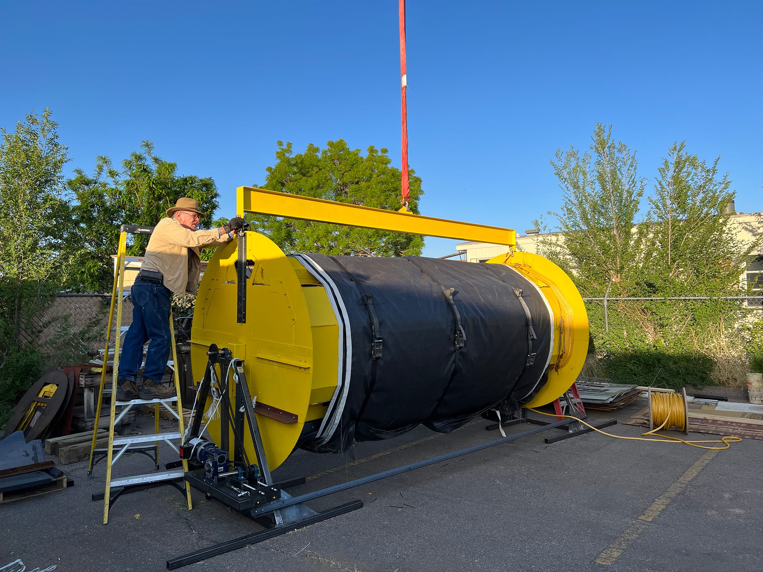 One of the key challenges, according to Fullam, is the size of the unit and getting it into the water. “A 600-m-long tube that’s 2m in diameter and weighs 5,000-6,000 lbs. — you have to figure out a way of handling that and getting it onto the boat from the shore and into the middle of the ocean and then into the ocean,” he said. “We came up with a simple spool concept. Make the buoy cylindrical and then just spool the tube onto it and then when you drop the heavy bottom weight into the water the buoy just rotates and unrolls the tube.”