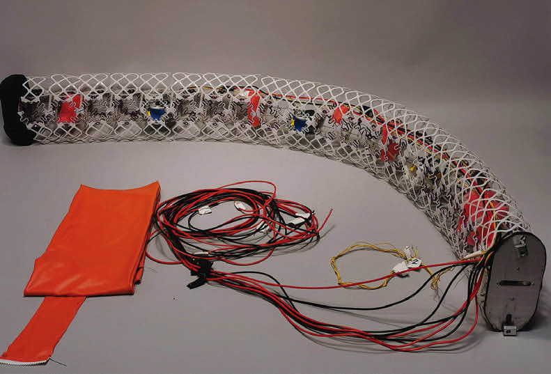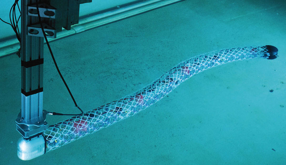 In one of the devices produced by the team, the voxels are attached end-to-end in a long row to form a meter-long, snake-like structure. The body is made up of four segments, each consisting of five voxels, with an actuator in the center that can pull a wire attached to each of the two voxels on either side, contracting them and causing the structure to bend. The whole structure of 20 units is then covered with a rib-like supporting structure, and then a tight-fitting waterproof neoprene skin. The researchers deployed the structure in an MIT tow tank to show its efficiency in the water and demonstrated that it was indeed capable of generating forward thrust sufficient to propel itself forward using undulating motions.