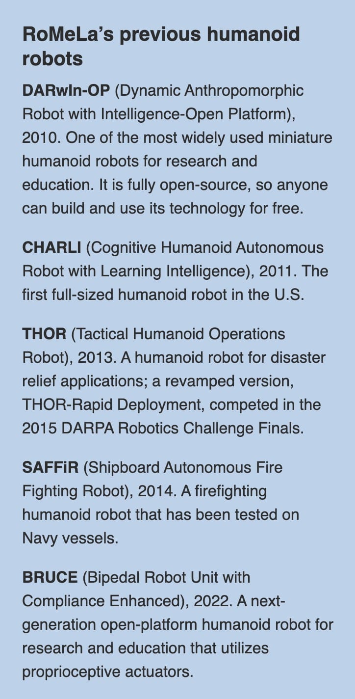“That is the key behind its excellent balance while walking on uneven terrain and its ability to run — getting both feet off the ground while in motion,” said professor and RoMeLa director Dennis Hong. “This is a first-of-its-kind robot.”