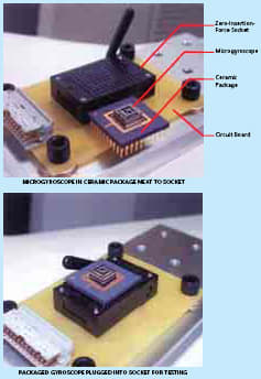 The modifications include a redesign of the microgyroscope package to eliminate the vibration-isolation beams while providing acceptably high Q values (4 × 104). The modified design includes a plug-in feature for quick testing (see figure). The plasma etch has been replaced by a wet etch, using a specially formulated KOH-based solution, that does not leave spikes. The design of the bridges has been modified to incorporate double notches, such that they can be cut without producing much debris, and a special suction tool resembling one used by a dentist has been developed to collect flying debris during cutting.