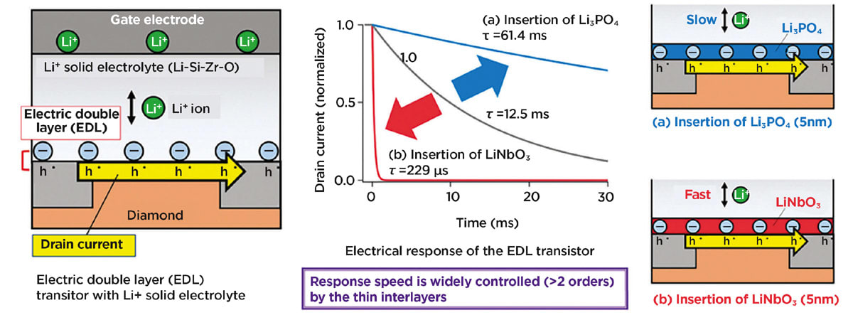 The interlayer accelerated and decelerated the EDL charging speed. The electrical response time of the EDLT was highly variable — it ranged from about 60 milliseconds (low speed switching for lithium phosphate/H-diamond interface) to about 230 microseconds (high speed switching for lithium niobate/H-diamond interface). The team, however, exhibited control over the EDL charging speed for over two orders of magnitude.