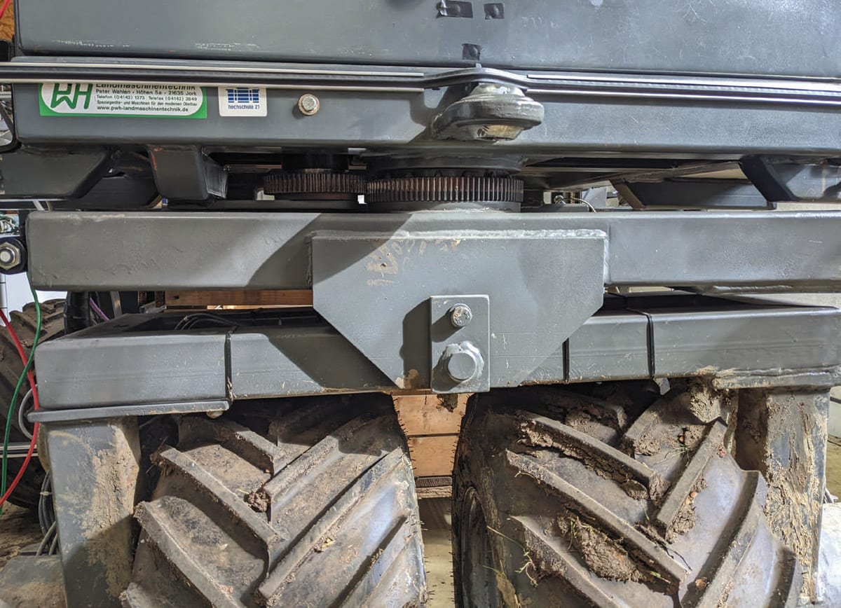 First, potential sensors must be extremely robust and resilient in the face of tough outdoor conditions (mud, dust, rain, strong sunshine, unevenness in the ground). Components in the PURE.MOBILE range of sensor modules from SIKO are particularly suitable for use in mobile machines under harsh environmental conditions. A double wheel is fitted to the back of the vehicle, which can rotate and thus control the steering. The steering angle is recorded, processed, and sent to the controller by the WV5800M magnetic rotary encoder.