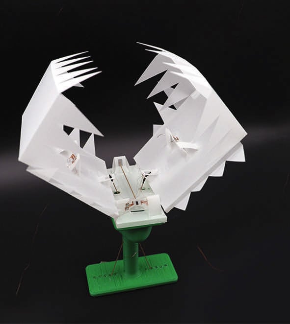 OrigaMechs derived their computing capabilities from a combination of mechanical origami multiplexed switches created by the folds and programmed Boolean logic commands, such as “AND,” “OR” and “NOT.” The switches enabled a mechanism that selectively output electrical signals based on the variable pressure and heat input into the system.