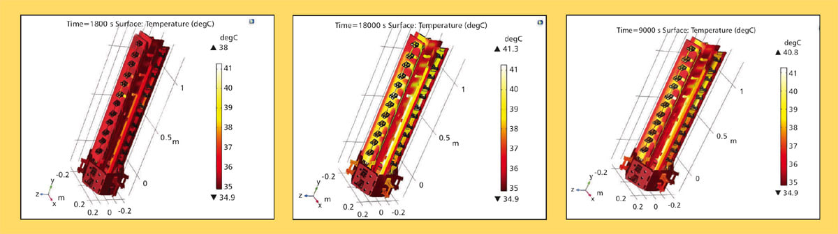 A transient heat transfer analysis of the complete panel assembly was done to ensure the thermal integrity of the system in operation. The validated simulation allowed the team to calculate the temperature rise for conditions that could not be evaluated experimentally. The thermally optimized connectors make the final design safer and more efficient than its predecessors (Figure 3). The resulting design is also modular and scalable.