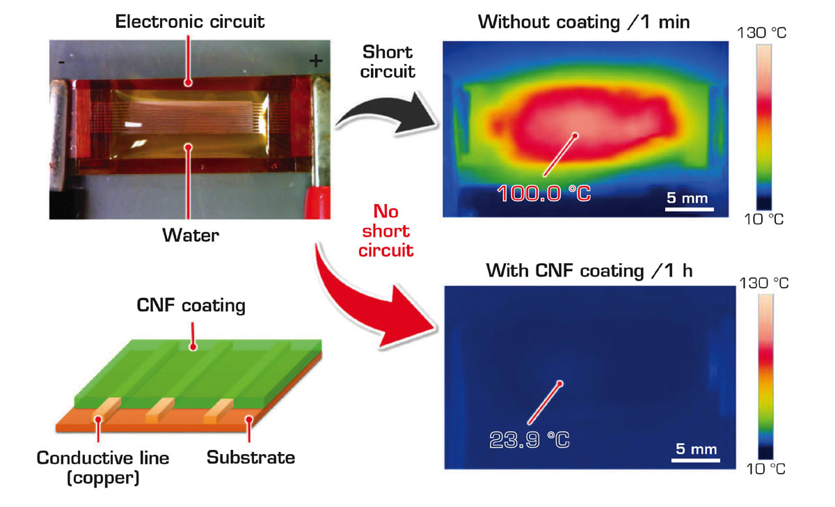 “In our initial work, an unprotected copper electrode failed after 5 minutes of dripping water onto it,” said Takaaki Kasuga, lead author. “Remarkably, a cellulose nanofiber coating prevented failure over at least a day of the same water challenge.”