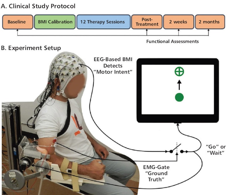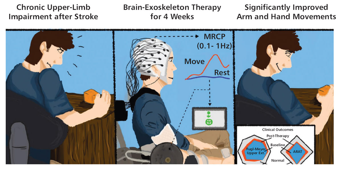 The trial involved training stroke survivors with limited movement in one arm to use a brain-machine interface (BMI), a computer program that captures brain activity to determine the subject’s intentions and then triggers an exoskeleton, or robotic device affixed to the affected arm, to move in response to those intentions. The device wouldn’t move if intention wasn’t detected, ensuring that subjects remained engaged in the exercise.