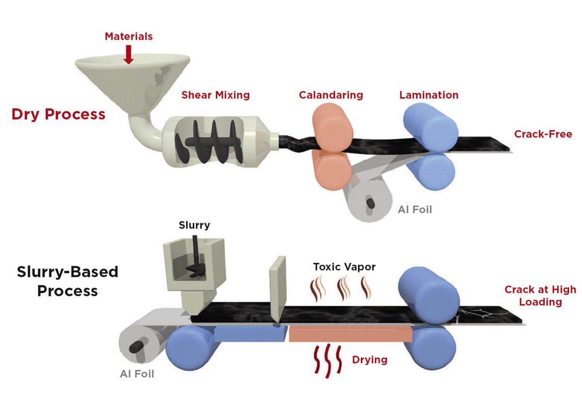 There are two main approaches currently being used for electrode manufacturing: wet and dry processing. The conventional slurry-based wet-processing approach applies the electrode materials in a liquid suspension that is subsequently dried to form the electrode layer. Scalability and cost continue to challenge industrial-scale slurry deposition, however, as the solvents necessary (i.e., NMP, N-methyl-2-pyrrolidone) are toxic and must be carefully recycled, this results in a lengthy and expensive process. 5 In dry coating, the electrode materials are instead bound by binder material to conductive carbon fibers, removing the necessity for these prohibitive solvents. However, this method is comparatively new, and there is still ongoing work to optimize manufacturing conditions to meet energy density and longevity demands.