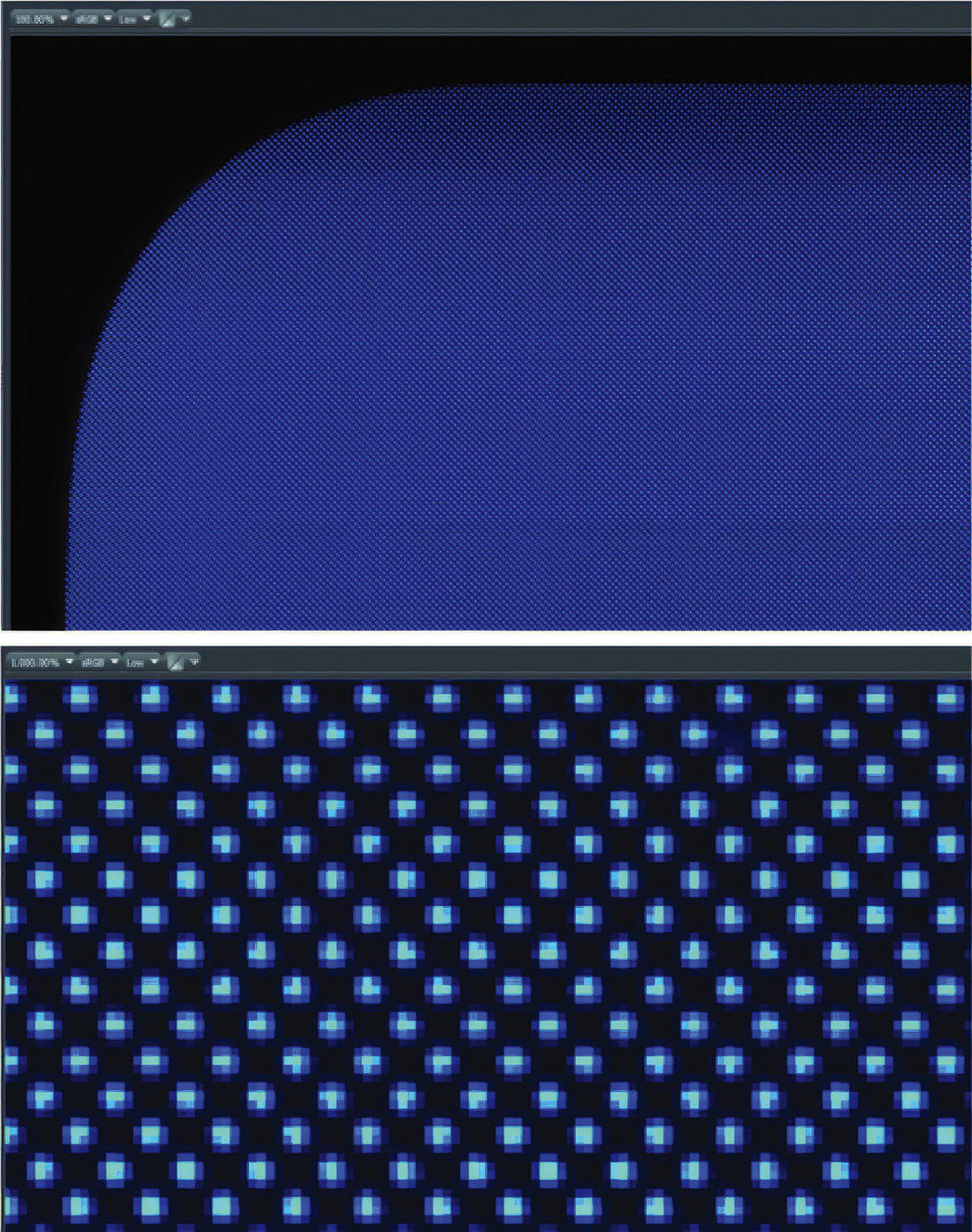The display of an OLED mobile phone was recorded for the absolute measurement. Figure 2 shows two shots of the blue screen at different zoom levels (2 × 2 shots). Each individual blue OLED pixel of the entire display can be captured with sufficient resolution for accurate color and luminance evaluation. Based on this data, a specially developed algorithm creates a pixel map with color and luminance values. This information can then be used for further analysis or calibration of the screen (demura in the case of OLED or μLED displays).