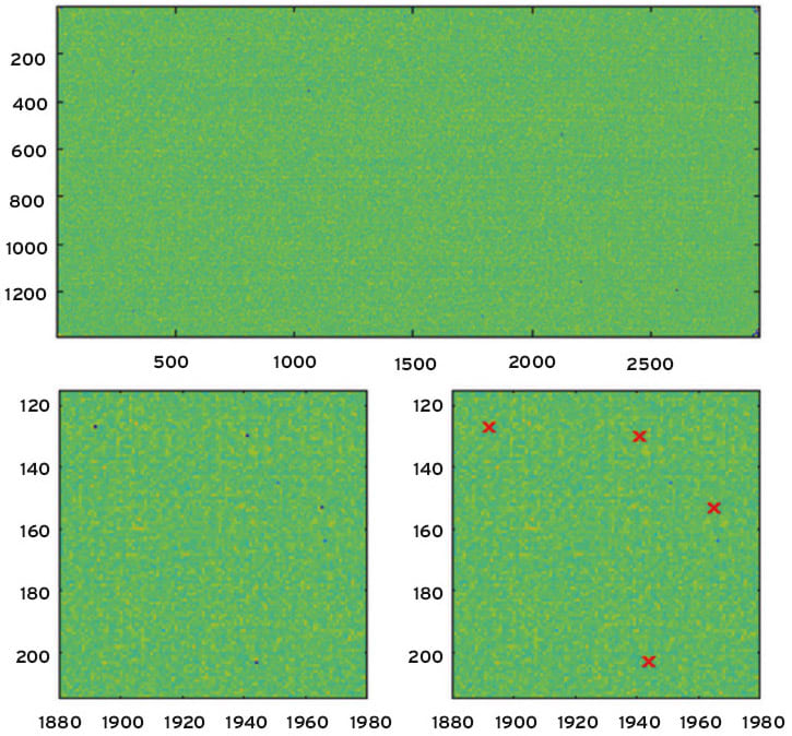 Some analyses – such as the detection of pixel defects or mura measurements – do not require absolute measurements of color and luminance. A particularly fast algorithm was developed for this purpose. This allows the analysis of entire displays in a single measurement with the LumiTop X150. The algorithm generates a pixel intensity map (Figure 4, top) and the user can set pass/ fail criteria to detect pixel errors. The two pictures in Figure 4 are zoomed sections. The red crosses in the lower right picture mark defective pixels according to the set criteria, here of 30 percent luminance deviation compared to the neighboring pixels.