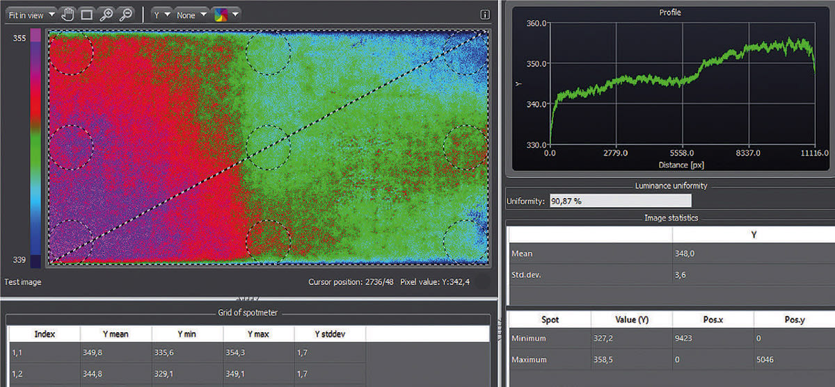 Figure 5 shows the luminance distribution in pseudo-color representation of an OLED tablet displaying white. The diagonal defines a line profile (from bottom left to top right). The corresponding diagram (Figure 5 top right) shows a significant luminance drop along this line. In addition, a grid of nine spots was placed on the image to obtain information about the maximum, minimum and average luminance as well as color within the spots. These results are presented in tabular form.