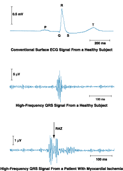 An electronic system that performs real-time analysis of the low-amplitude, high-frequency, ordinarily invisible components of the QRS portion of an electrocardiographic signal in real time has been developed. Whereas the signals readily visible on a conventional electrocardiogram (ECG) have amplitudes of the order of a millivolt and are characterized by frequencies