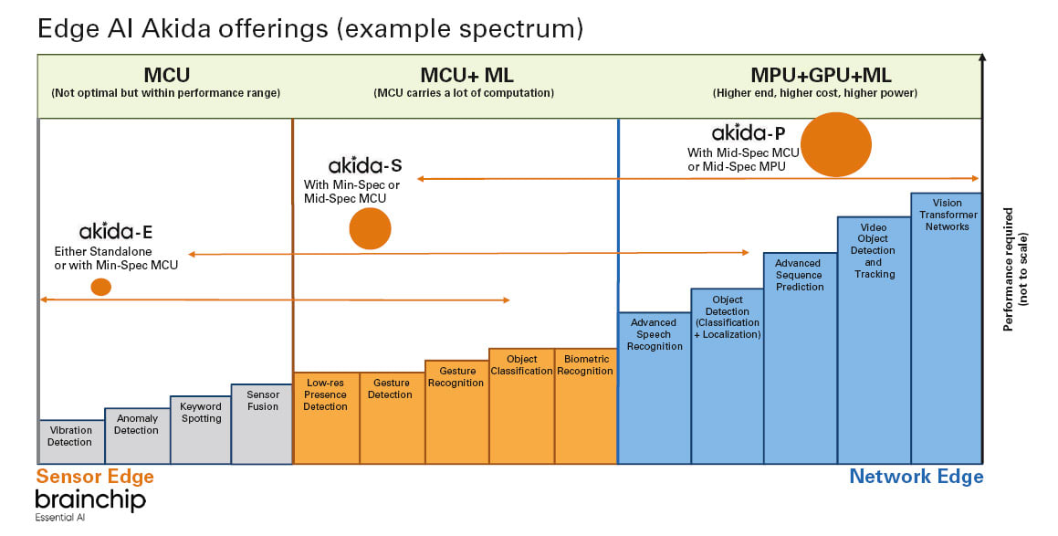 According to Nayampally, the series is focused on three general configurations (See Figure 2). The Akida-E is the most basic of the solutions, dealing with sensor inputs like vibration detection, anomaly detection, keyword spotting, and sensor fusion. Akida-S is more mid-range. It can do microcontroller (MCU)-level machine learning for more complex tasks such as presence detection, object classification, and biometric recognition. Finally, on the right-hand side of the figure, the Akida-P can perform higher-level tasks using a microprocessor (MPU) for tasks like advanced object detection or sequence prediction.