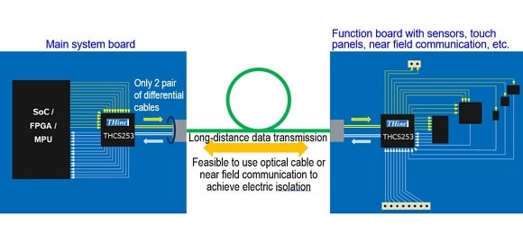 Thine Electronics, Tokyo, Japan, has released its new serial transceiver products, THCS253 and THCS254, which enable systems with many peripheral sensors to simplify cabling for the sensor and control functions. They can serialize different types of signals. For example, THCS253 can serialize sensing signals using 32 GPIO interfaces into two differential signals that can drastically reduce the number of cables and connectors by up to 88 percent.