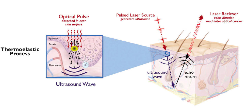 NCLUS employs a pulsed laser that transmits optical energy through the air to the skin surface, where the light is rapidly absorbed once in the skin. The optical pulse causes instantaneous localized heating and rapidly deforms the skin through a thermoelastic process that in turn generates ultrasonic waves, acting as an ultrasound source — a phenomenon called photoacoustics.