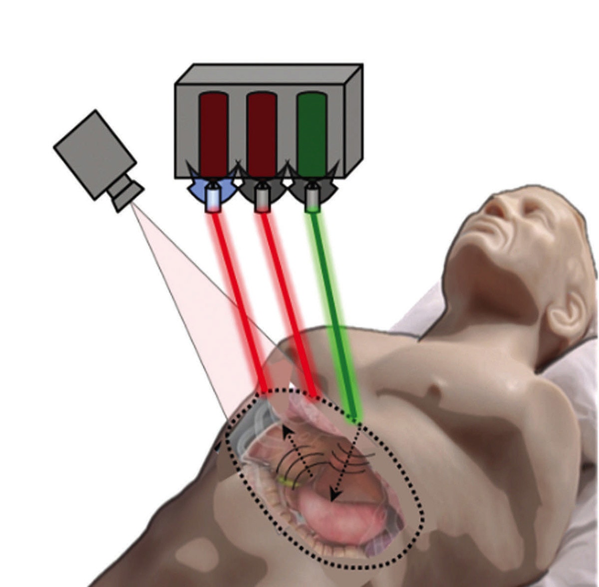 The ultrasound echoes returning from the tissue interior emerge at the skin surface as localized vibrations, which are measured by a highly sensitive, specialized laser Doppler vibrometer.