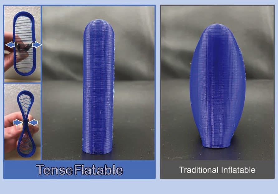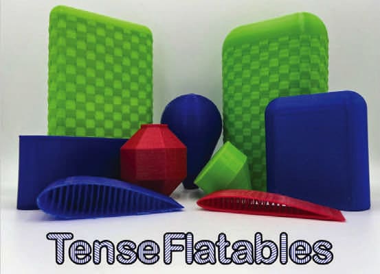 Reliance on an additive technique allows to customize the external shapes as well as the internal tensegrity mesh and achieve application-specific design and performance. The simplification of the design and manufacturing process makes it significantly cost and time efficient, while allowing at-scale and at-rate manufacturing of TenseFlatables via automation.