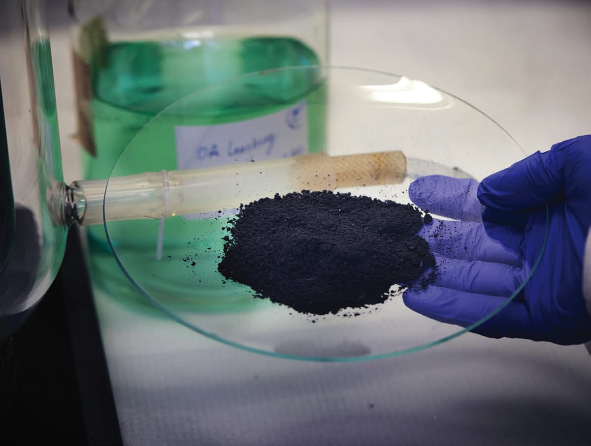 In Chalmers’ battery recycling lab, Rouquette and research leader Martina Petranikova have shown how the new method works. The lab has spent car battery cells and, in the fume cupboard, their pulverized contents. This takes the form of a finely ground black powder dissolved in a transparent liquid –oxalic acid.