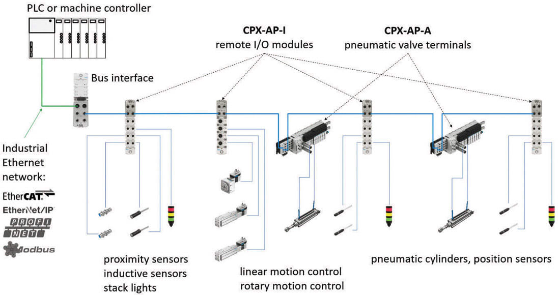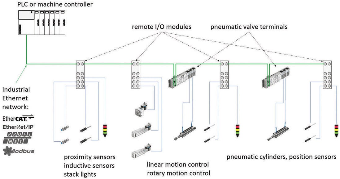 Remote I/O modules and valve terminals connect to the PLC via the industrial Ethernet network. Common industrial protocols are EtherNet/IP, PROFINET, EtherCAT, and Modbus TCP. Industrial Ethernet networks reduce the number of hard-wired connections in the control cabinet, increase the amount of diagnostic information that can be acquired from the machine, and pave the way for predictive maintenance programs.