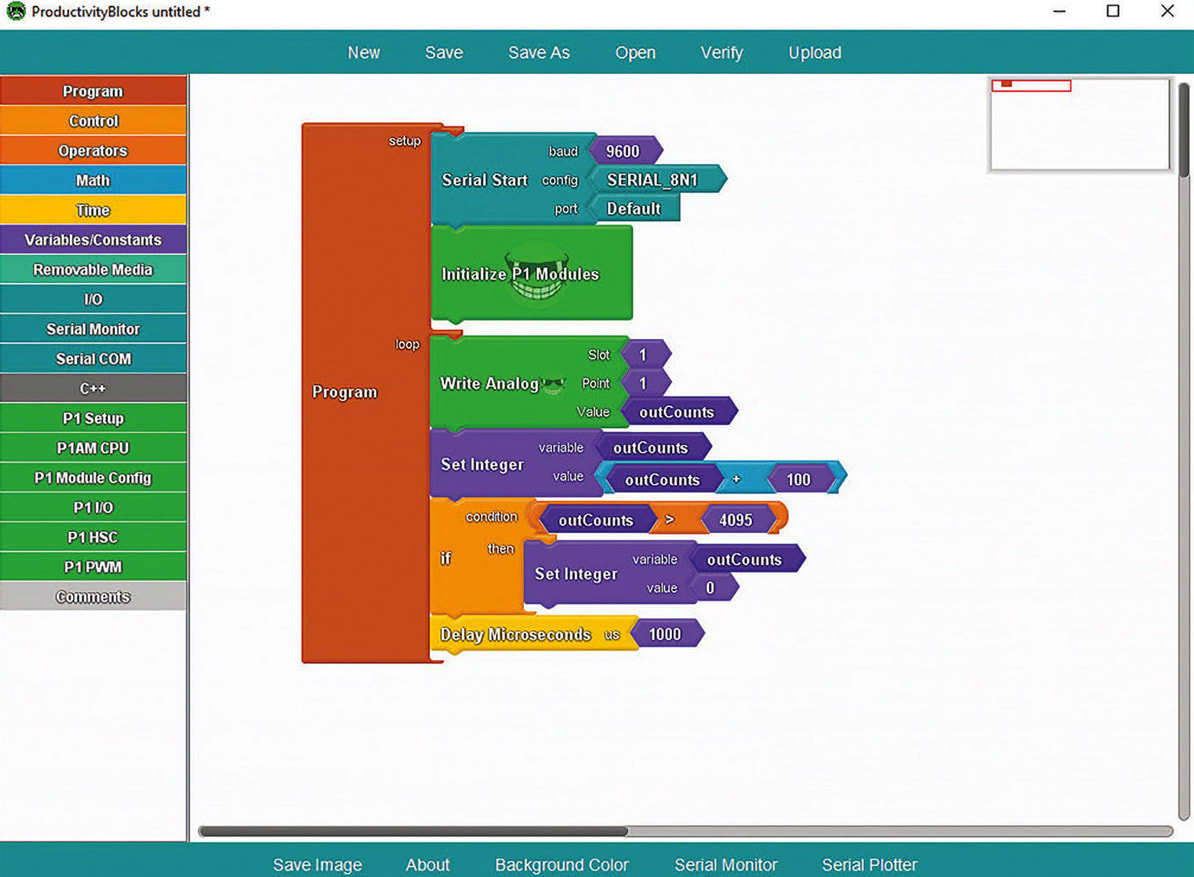 Programming could be accomplished using standard C++ code, or by using the free ProductivityBlocks graphical block diagram development environment, to quickly assemble typical functions using drag-and-drop blocks (Figure 2). The temperature data could be aggregated, scaled, and evaluated for high/low alarm values, with the results transmitted to the cloud over Ethernet using the industry-standard MQTT protocol, for example.