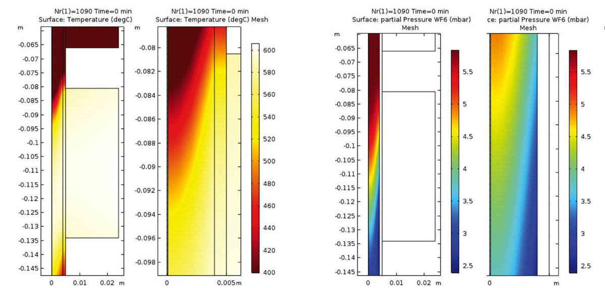 The single-fiber setup to develop the new models for the chemical vapor deposition rate of tungsten is shown in Figure 2, including a preheater and a main heater. The researchers wanted to see how fast the tungsten would grow and how this rate of growth was affected by the temperature and partial pressure. They then adjusted the tungsten hexafluoride (WF6) reaction order between one and zero, depending on the temperature and the WF6 partial pressure. To do so, they used numerical modeling to study the fluid dynamics of the gas mixtures, heat transfer of the thermal losses, and chemistry and rate equations for the chemical reactions at the deposition surface (Figure 3).