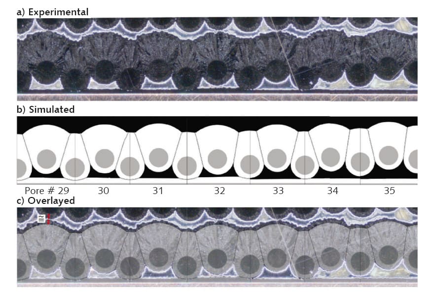 A macroscaled CVD reactor model returned the partial pressures as input for microscale transient simulations. For this, Raumann modeled the W coatings growing onto multiple adjacent W fibers as well as the surface-to-surface contact of the W coatings and the corresponding potential pore formation. In Raumann’s dissertation, 1 he validated these models successfully by comparing experiments for the deposition rate, pore structure, and relative densities of the CVD process of Wf/W (Figure 4). In a third step, the multifiber model was used for a CVD process parameter optimization to successfully improve the simulated and later also experimental material density.