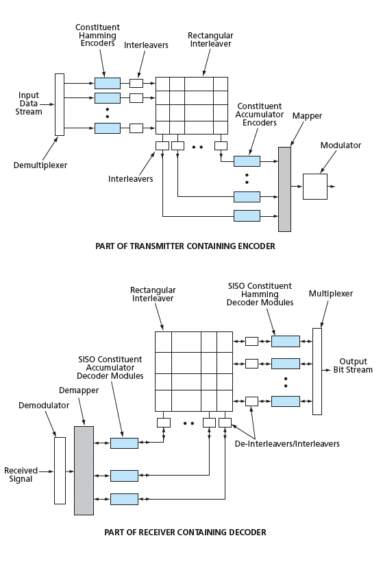 In one instantiation of the scheme, the outer code would consist of 372 Hamming codes characterized by a block length of 15 symbols, of which 11 would be information symbols [denoted a (15,11) code in the art]. The inner code would consist of 15 rate-1, two-state accumulator codes of block length 372. The parallel nature of the interleaver would enable the permutation of the 15 symbols of each of the 372 Hamming code words by 372 independent interleavers, and the 15 groups of 372 Hamming symbols would be permuted by 15 independent interleavers before being fed to the 15 accumulators. This code structure at the transmitter would enable the use, in the receiver, of a high-speed iterative decoder that could include 372 soft-input, soft-output (SISO) modules to decode the 372 constituent Hamming codes in parallel and 15 SISO modules to decode the 15 constituent accumulator codes in parallel. Hence, the overall decoder could have a parallel architecture.
