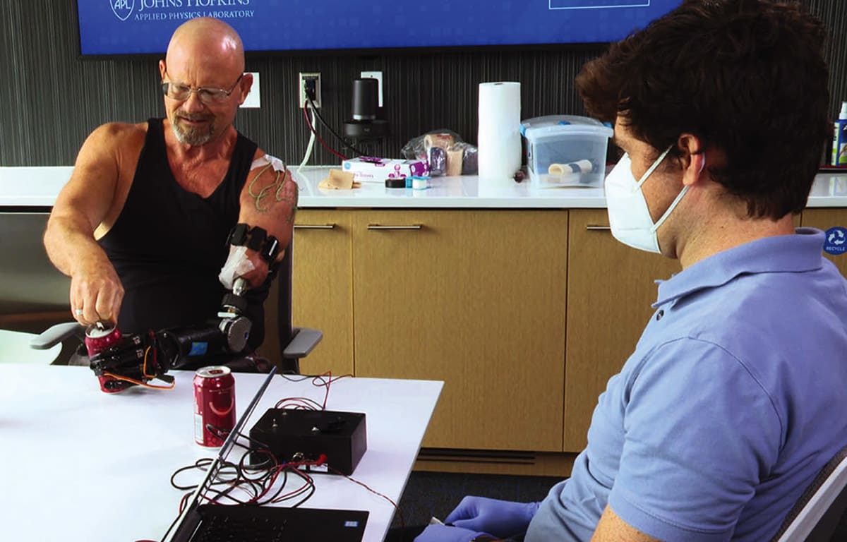 “When someone loses part of a limb, the nerves within the residual limb are still there, which can lead to the ‘phantom’ limb sensation,” said Luke Osborn, a neuroengineering researcher who leads much of APL’s noninvasive nerve simulation work. “You can place electrodes on different parts of an amputee’s upper arm where those nerves have regrown and stimulate sensation — typically pressure, but in the current case, temperature — and the individual can tell us where in their phantom hand they feel those sensations.”