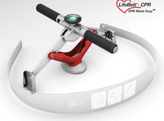 Developed by Thomas Lach of Deca-Medics Inc., Columbus, OH, LifeBelt overcomes a critical limitation of “hands-only” CPR: the average rescuer is only capable of producing effective chest compressions for about two minutes, far shorter than the typical eight to ten minute emergency response time. With LifeBelt, half as much force is needed, resulting in less fatigue and longer-duration compressions – increasing the likelihood of a successful resuscitation.
