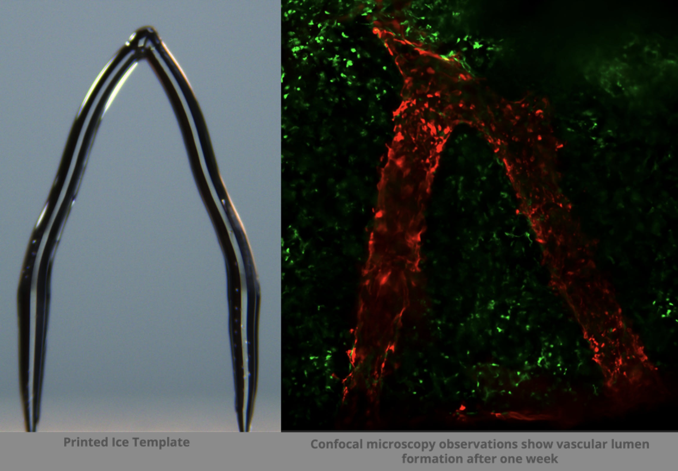 These 3D-printed ice templates are then embedded in a gelatin material, GelMA. When exposed to UV light, the gelatin hardens, and the ice melts away, leaving behind realistic blood vessel channels.