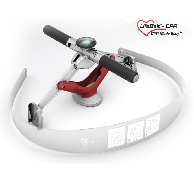 The design is compact and lightweight, easy to clean, and uses an intuitive readout to warn if the compression depth is too deep or too shallow. It has an innovative belt that quickly attaches in order to enable a rescuer to start CPR in 15 seconds or less.