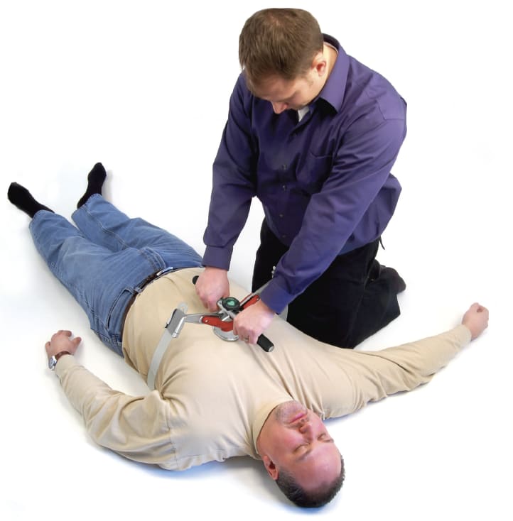 The LifeBelt CPR device makes it easy for anyone to perform high-quality CPR compressions for extended periods of time. The LifeBelt has three main features that make it better than “hands-only” CPR. First, only half as much force is needed, resulting in less fatigue and more effective compressions over longer periods of time. It also means that smaller people will find it much easier to give CPR. Second, there is feedback that gives the rescuer confidence that he or she is not pushing too hard, or hard enough. And third, the device has comfortable hand grips to allow for less stress and fatigue.