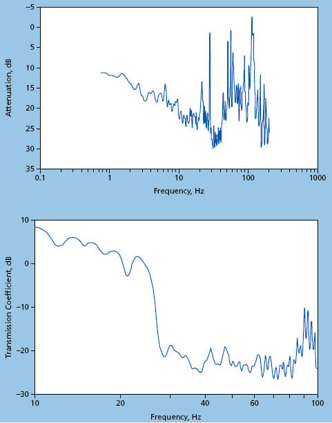 The windscreen that performed best in the wind-tunnel tests was a cylinder made of polyurethane foam of a type known in the industry as "eightpounder," having an inside diameter of 3 in. (7.62 cm), a wall thickness of 0.5 in. (1.27 cm), and a length of 12 in. (30.48 cm). The attenuation of wind-generated noise was quantified as the ratio between the wind noises measured without and with this windscreen. The results, plotted in the upper part of Figure 1, show that this windscreen attenuated wind noise by amounts ranging from 12 to 20 dB at frequencies ranging from 0.7 to 20 Hz. The large spikes in the spectrum represent aeolian tones generated by the wind passing over the windscreen, but these lie above the infrasonic range.