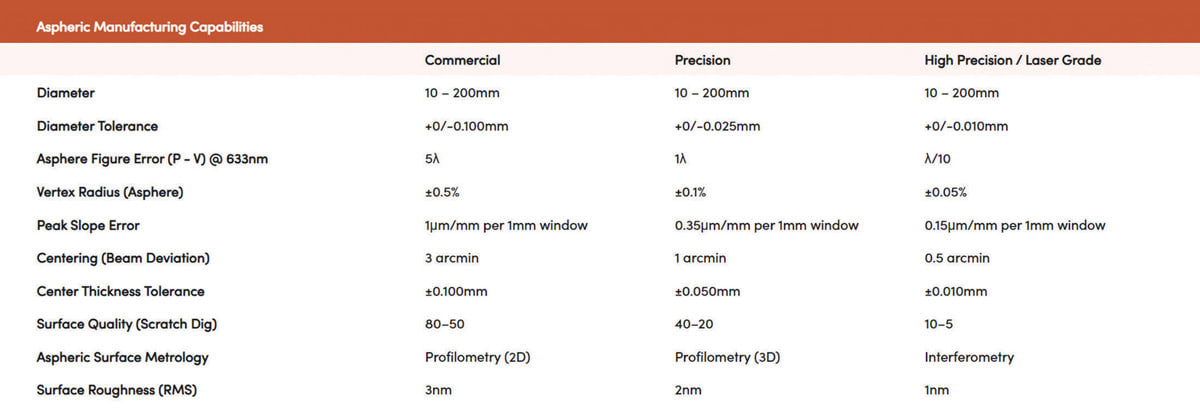 While most aspheres can be toleranced similarly to spherical components, there are differences to consider. Key considerations include vertex radius, conic constant, aspheric coefficients, sag table, form error (including vertex radius and irregularity), mid-spatial frequency errors (tolerance slope plus integration length), and centration errors (requiring both tilt and decenter parameters). Striking the right balance in tolerancing is essential; under-tolerancing may lead to performance issues, while over-tolerancing can introduce unnecessary complexity and costs. Talk to your optical manufacturer early to find the best balance of minimal cost and maximum performance in the asphere tolerancing process.