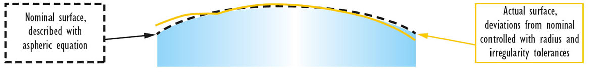 This is a measurement of surface deviation from the nominal surface. Data is supplied either interferometrically or via profilometry as a 3D surface map or 2D line scan. Do not tolerance the conic constant or aspheric terms in the asphere equation. Use radius and irregularity tolerance to control permissible form error.