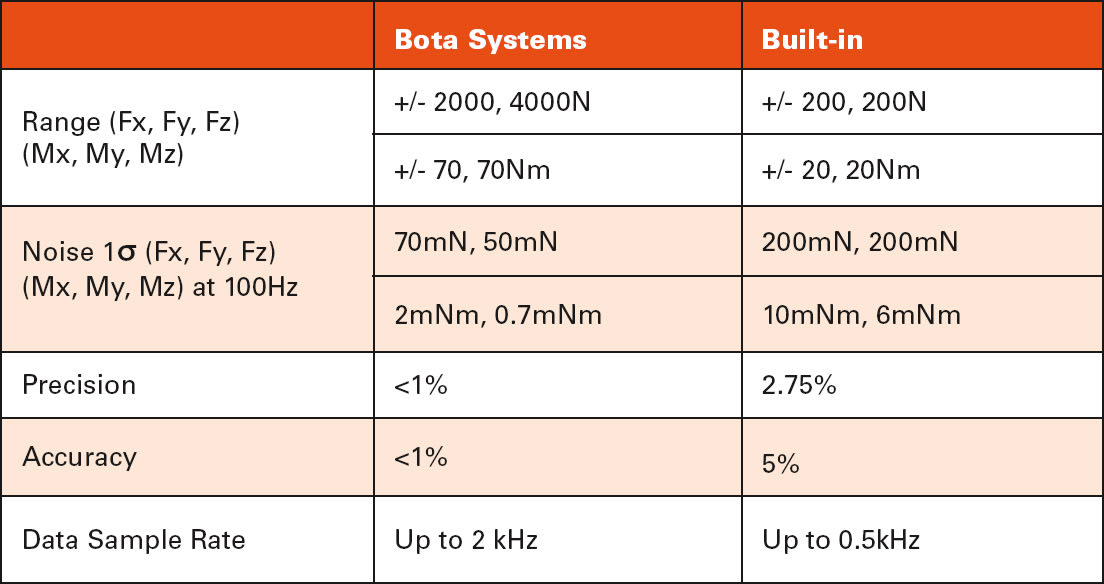 The Bota sensor outperforms the built-in sensor across many criteria (see Table 1), where precision, noise, and accuracy are all substantially better. The maximum data sampling rate is also four times higher, at 2 kHz compared to 0.5 kHz.
