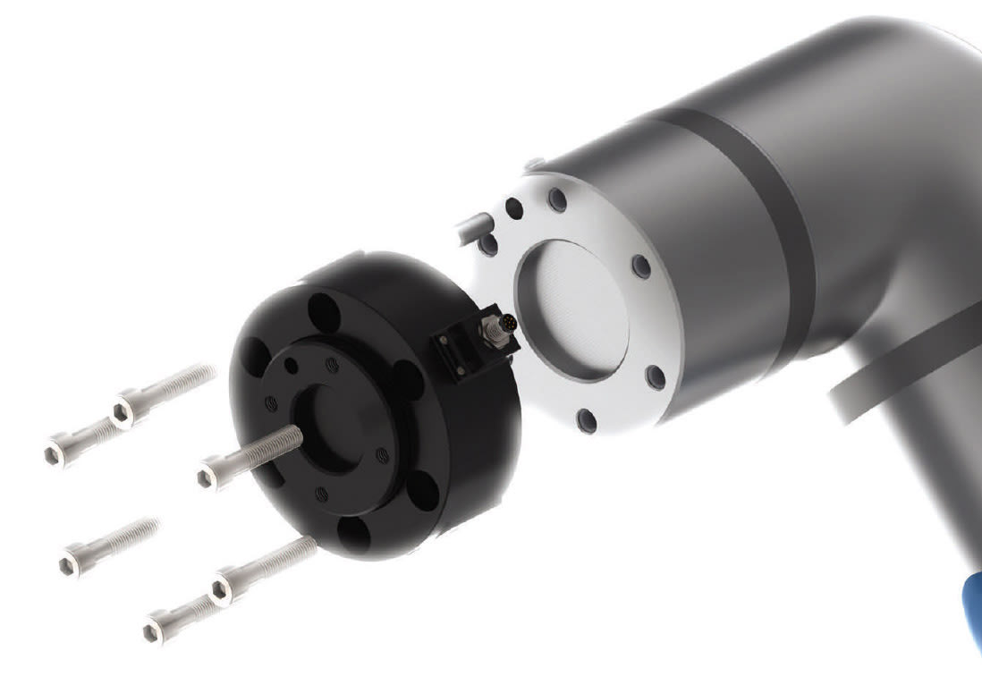 A typical robot-tooling interface configuration utilizing a force torque sensor is shown in Figure 2. No mechanical adapter is required, since the Bota force torque sensor is mounted directly onto an EN ISO-9409-1-80-6-M8 flange.