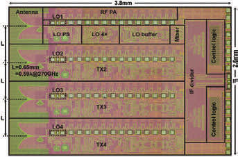 A phased-array transmitter design from NTT, Tokyo, Japan, overcomes common problems of CMOS technology in the 300 GHz band. Thanks to its area efficiency, low power consumption, and high data rate, the proposed transmitter could pave the way for many technological applications in the 300 GHz band, including body and cell monitoring, radar, 6G wireless communications, and terahertz sensors. 300 GHz transmitters/receivers can capitalize on low atmospheric absorption and the potential for extremely high data rates.