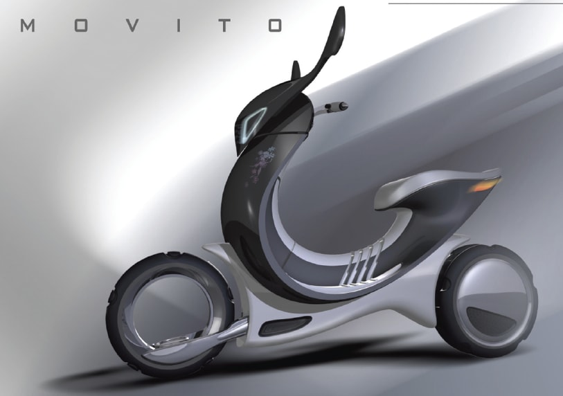 Movito is a scooter based on an electric inwheel motor, a hubless front wheel, and a modular base system. It is designed for traveling short distances in and around the city.