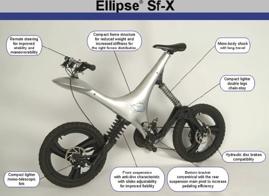 The Ellipse® Sf-X is an all-terrain bicycle with a front section concept that separates the steering system from the damping system. The suspension system is interconnected with the bicycle frame structure, lowering the center of gravity during braking, and eliminating the ability for the bicycle to roll over. The rear wheel is loaded during the braking process, so overall braking performance is improved and the rider can stop the bicycle in a shorter distance. All of its components, except the frame and front and rear forks, are current production bicycle components.