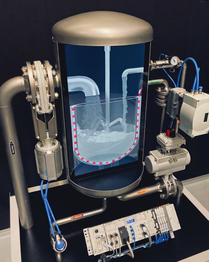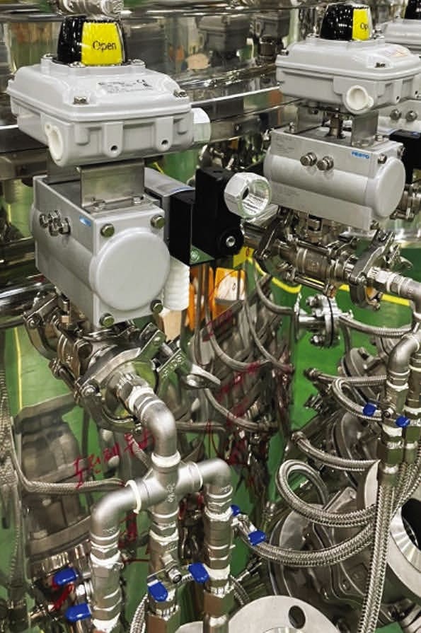 In slurry batch processing, many different types of valves and valve sizes are used. For example, the size of the piping and the pressure exerted by the flow of liquid at one point in the mixing process is so strong that the plant specified the largest Festo DFPD quarter-turn actuators, rated at up to 517 lbf (2300 N) of torque.