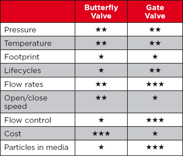 Gate valves, on the other hand, are best for slurry, sludge, and high particulate media, as well as proportional control applications. Table 1 shows how the two standard industrial valves compare in relative terms to important considerations for automated applications. A single ★ rating has the lowest relative value in the category while a ★★★ rating offers the highest.