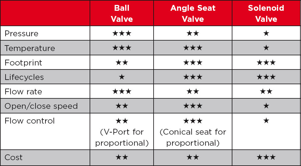 As pressure and/or temperature increases, ball and angle seat valves provide an overall advantage due to the standardization on highly resilient materials like stainless steel housings and PTFE seats. However, the larger an angle seat valve becomes, the lower its pressure rating, losing some of its advantage in this category (Table 2).