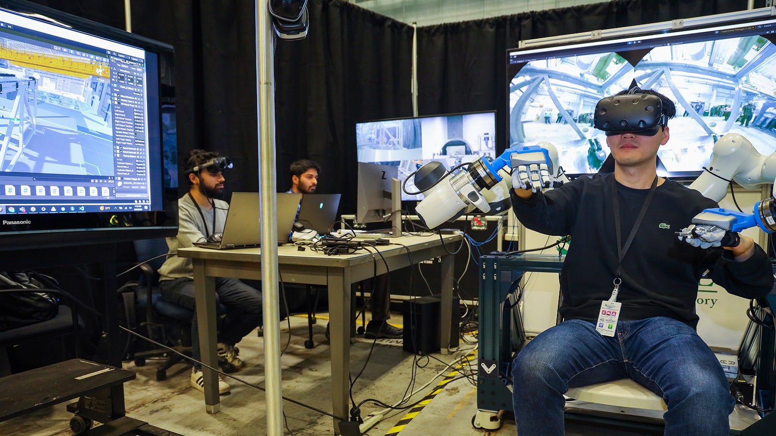 Seated at a digital workstation, operators equipped with a virtual reality headset and touch-sensitive haptic gloves can control the robots physically and virtually at the same time. When the operator moves its arms, the dual-armed robot mimics the movements. The touch-sensitive gloves allow the operator to effectively touch and feel objects in a natural way. Sensors on the gloves provide operators with direct feedback that helps improve the precision and accuracy of the task.